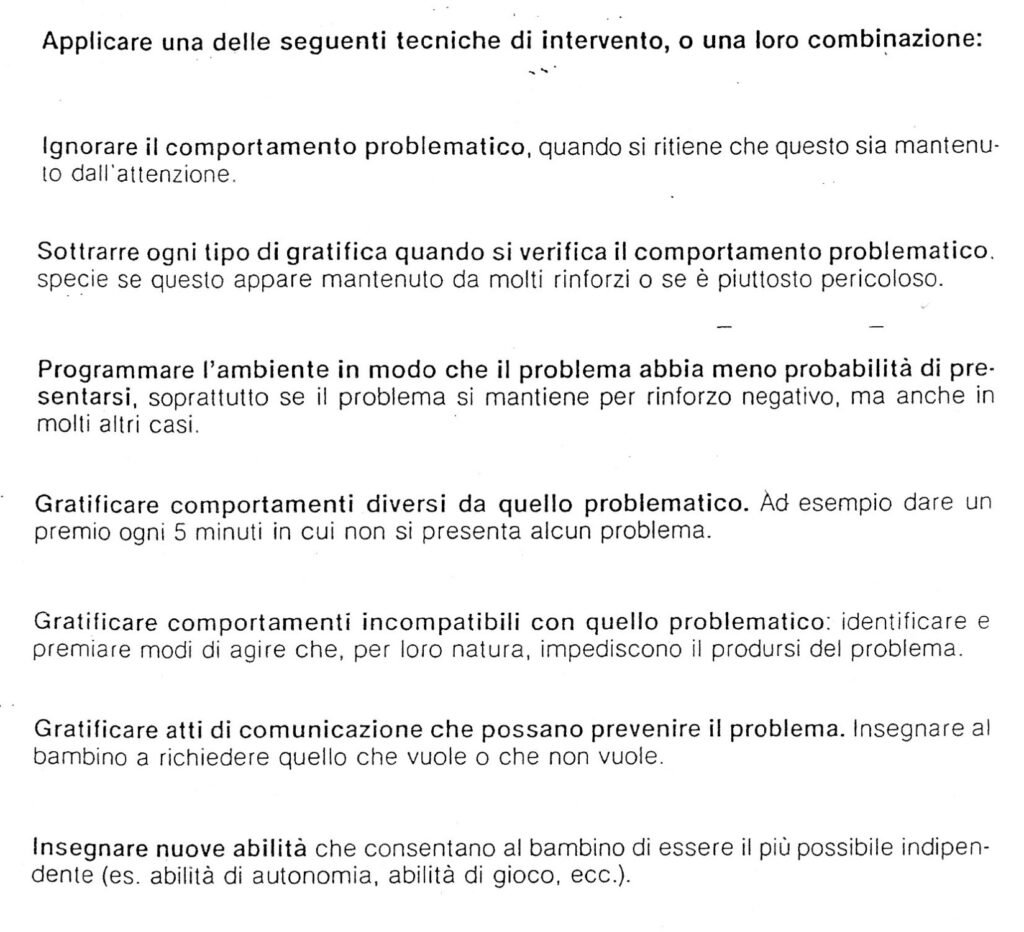 ⏩ tramite alcuni accorgimenti utili non solo a ridurre i modi di fare problematici, ma ad insegnare nuove abilità collaborative. In tal senso, ci può essere utile la gratificazione a intervalli regolari (Mamma insegnami qualcosa di nuovo), consistente nel dare conseguenze positive al bambino in spazi di tempo regolari che possono via via aumentare. Altre pratiche utili possono essere la scelta dei comportamenti incompatibili (Definici e gratifica), ovvero di quelle azioni che non possono essere svolte nello stesso momento di un comportamento problematico e/o l’incremento dei comportamenti comunicativi (Mi insegni a parlare?), ovvero insegnare al bambino a chiedere le cose prima che si manifesti il suo modo di fare disadattivo.